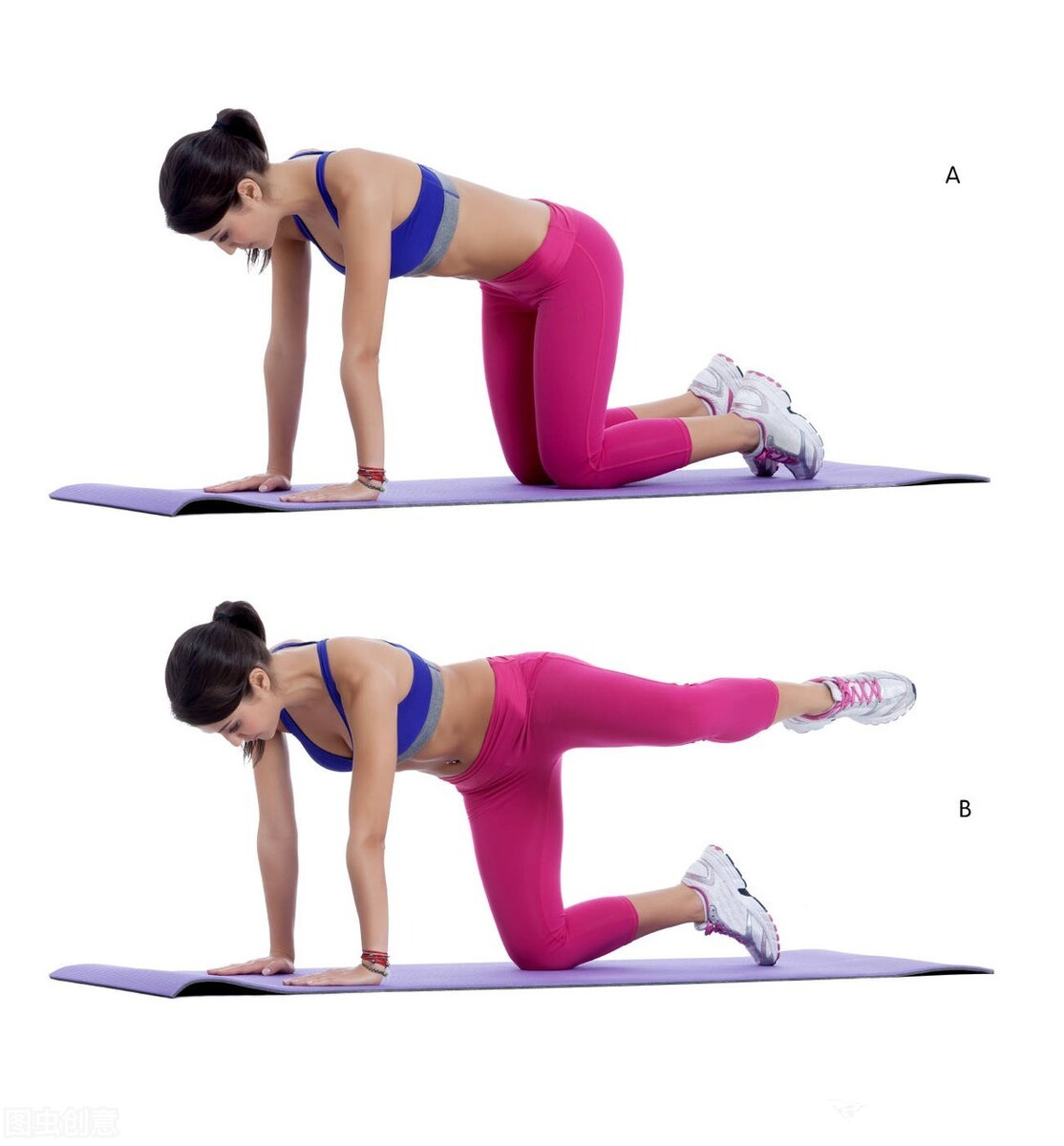注意:选择一只脚做向后抬起脚的动作,可以增强单侧臀大肌的收缩效果,更平衡地承受两侧的力量。